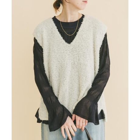リボンのような平たい糸を編み込んだ、立体感のあるリボンヤーン素材を使用。独特の毛足感と凹凸のある編み地が、いつものコーデに華やかな奥行きを与えます。ふんわりと軽やかな見た目ながら、存在感はしっかりと主役級。顔周りをすっきり見せる深めのVネックに、程よくゆとりのあるシルエットでレイヤードも快適です。サイドスリットが動きを軽やかにし、肩にかかるデザインが二の腕をさりげなくカバー。アクセサリー感覚で楽しめる、大人のためのこなれベストです。