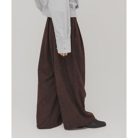 表面がスエード調、裏面はさらっとしているピーチスキンWIDEパンツ。リラクシーな穿き心地が叶うウエストゴム仕様ですが、ベルトループを付けることできちんと感も残しました。大人カジュアルな着こなしにぴったりな1着です。