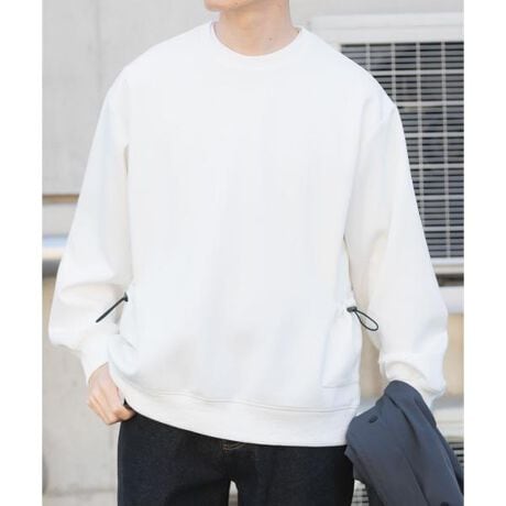 スウェットよりハリがあり、ニットよりもすっきりと見えるダンボールニット素材を使用したプルオーバー。滑らかな表面感と程よい厚みで、カジュアルながらもクリーンな印象をキープします。最大のポイントは、両サイドに配したドローコード付きストレージポケット。実用性はもちろん、無地デザインにアクセントを加え、絞り具合で表情の変化も楽しめます。身体を包み込むオーバーサイズシルエットに、リブでメリハリをプラス。ワイドから細身までボトムを選ばず、デイリーに頼れる主役トップスです。