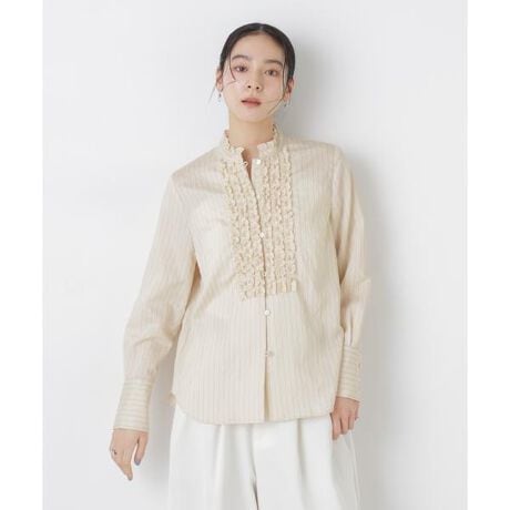 フロントにフリルディテールをあしらった華やかなブラウス。シャツ型をベースにした甘さ控えめのデザインがきれいめにもカジュアルにも合わせやすく、ON/OFFで着回せる万能アイテムです。