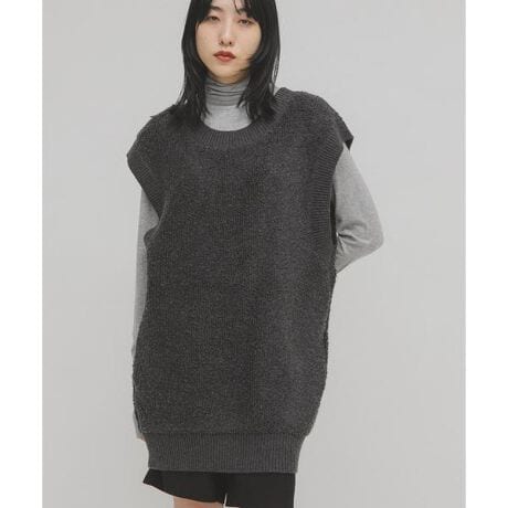 絨毯のような編地が特徴的なニットベストワンピース。ベストのような感覚で様々なアイテムとのレイヤードを楽しめます。前後2WAY仕様になっており、深めのUネックは抜け感を叶えます。ショートパンツやタイツを合わせワンピースのように着たり、シャツやワイドボトムを合わせたシックな合わせもおすすめです。