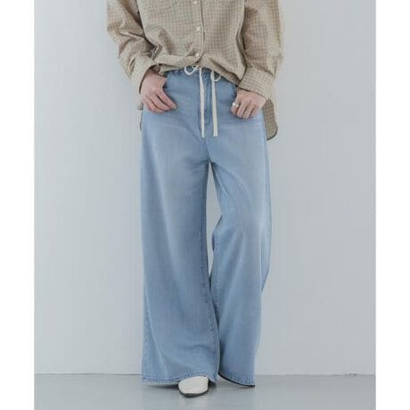 腰回りはすっきりとしながらも、裾に向かって広がるワイドシルエットで、風通しも良く夏にぴったりのジーンズです。程良い落ち感との柔らかな着心地が特徴のリヨセル混のデニム素材を使用しています。