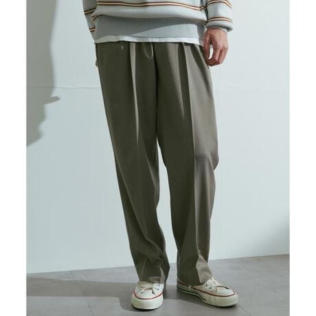 ・ウエストにツータックをいれたワイドテーパードシルエット。ウエストの総ゴムは目立ちにくい仕様