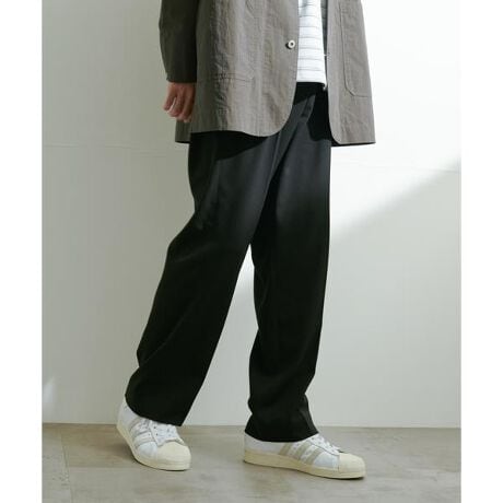 ・ウエストにツータックをいれたワイドテーパードシルエット。ウエストの総ゴムは目立ちにくい仕様