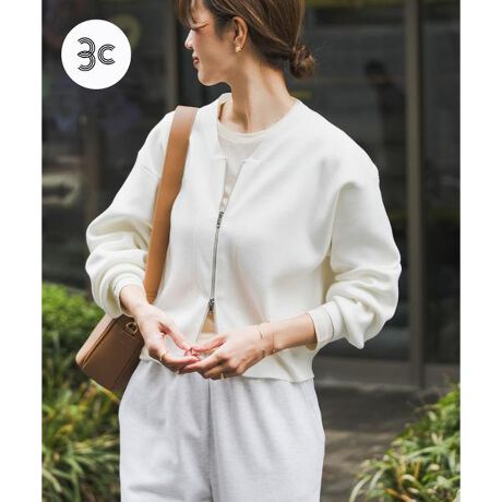 一枚着のデザイントップスとしても、羽織りとしても着用できるフロントZIP仕様で、着こなしの幅が広がります。