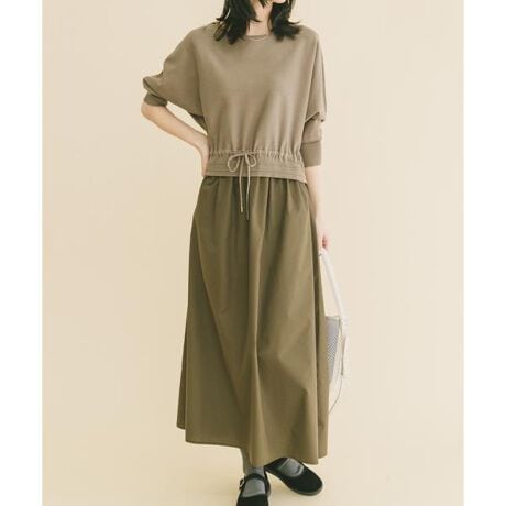 柔らかなニットトップスと、軽やかに広がるスカートを一体化したニットドッキングワンピース。上下のコーデに悩まず、1枚で洗練されたスタイルが即完成します。異素材の組み合わせが奥行きを生み、シンプルながらも手の込んだ印象に。ウエストはドローストリング仕様で、絞り具合を調整すれば脚長効果と女性らしいメリハリを演出。ゆったりとしたドルマンスリーブが二の腕をさりげなくカバーし、「楽なのにきれい」を叶える毎年人気の一着です。