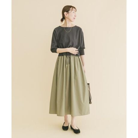 柔らかなニットトップスと、軽やかに広がるスカートを一体化したニットドッキングワンピース。上下のコーデに悩まず、1枚で洗練されたスタイルが即完成します。異素材の組み合わせが奥行きを生み、シンプルながらも手の込んだ印象に。ウエストはドローストリング仕様で、絞り具合を調整すれば脚長効果と女性らしいメリハリを演出。ゆったりとしたドルマンスリーブが二の腕をさりげなくカバーし、「楽なのにきれい」を叶える毎年人気の一着です。