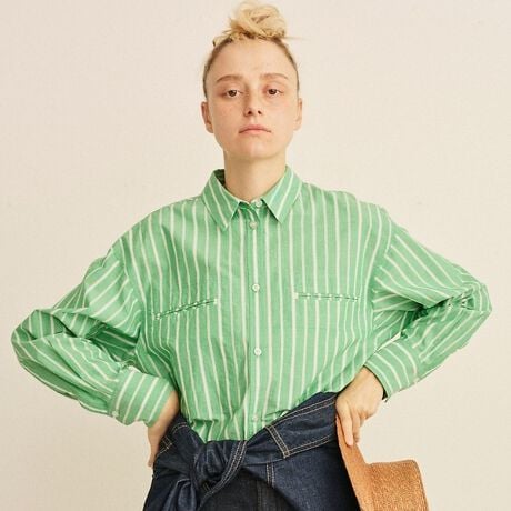 存在感のあるストライプが目を引く胸ポケットシャツ。