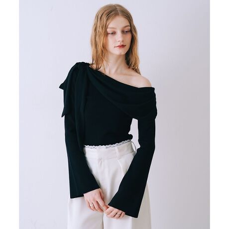 アシンメトリーにかかるドレープデザインと程良いボリュームのあるリボンが印象的なワンショルダートップスでリボンは取り外し可能◎