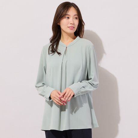 適度な伸縮性があり、フォーマルスタイルの定番素材のセラテリー梨地で作ったブラウス。