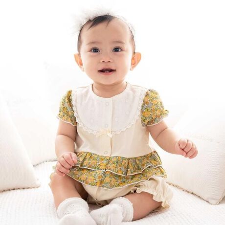 天竺素材、リバティプリント、シフォンが織りなす、異素材ミックスの華やかで上質な女の子用半袖カバーオールです。