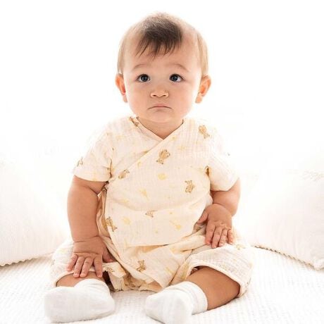 通気性の良いガーゼ素材に、愛らしい動物たちを散りばめた男女兼用カバーオールです。
