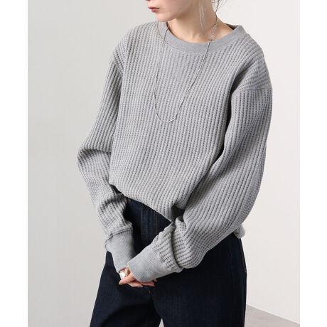 秋、冬、春とロングシーズで人気のある定番アイテムです。ワッフル素材特有の型崩れを抑えるため、綿80%/ポリエステル20%の混紡糸を使用しています。スウェットのようにラフに着たり、綿ニットのようにシャツとのレイヤードなど、カジュアルからきれいめまで着こなしの幅が広がります。
