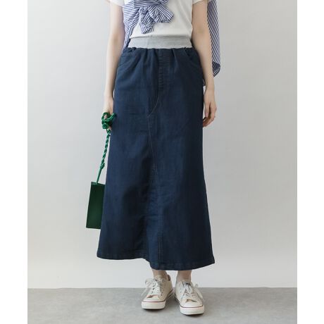 aity アイティ ゆったりウエストとセミタイトなシルエットが綺麗なウエストリブデニムスカートです。
