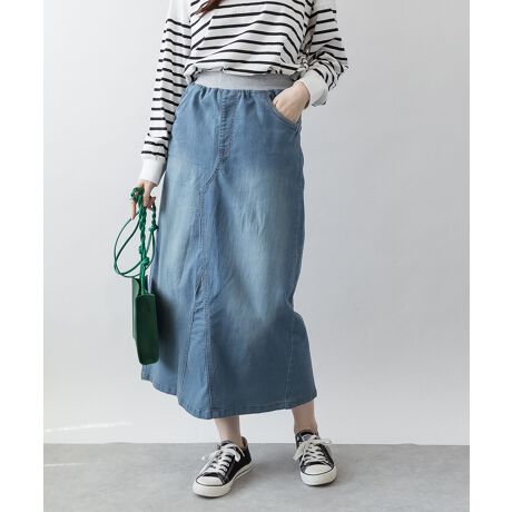 aity アイティ ゆったりウエストとセミタイトなシルエットが綺麗なウエストリブデニムスカートです。