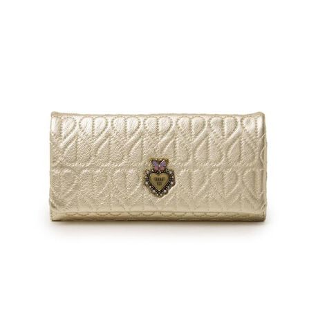 ハートのキルティングと繊細なブローチが印象的な、フェミニンでどこかクラシックなムードを纏った「ドリーミー」シリーズ。甘くなりすぎないハートモチーフに、バタフライを組み合わせたANNA SUIらしい世界観が、大人の可愛らしさと上品さを演出します。軽やかで柔らかなレザーを使用し、手に馴染む心地よい質感に仕上げ、日常使いでもストレスのない使い心地を実現。箔加工を施した革は、光沢を抑えた上品な表情と繊細なカラーリングが魅力で、長く使うほどに味わいが増します。薄マチの長財布や、収納力のあるかぶせ長財布、定番の口金二つ折り財布、マルチケースやパスケースまでラインナップが充実しており、ライフスタイルや用途に合わせて選べるのもポイント。デイリー使いはもちろん、ギフトや記念日の贈り物にも最適な、ANNA SUIならではの華やかさと実用性を兼ね備えたシリーズです。【メーカーサイズ寸法(実寸)】サイズ:H:9.5/W:19.5/D:3.5/重さ:160g/外装背面フリーポケット:1/札入れ:1/小銭入れ:1/カードポケット:16/フリーポケット:3