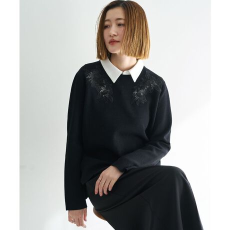 胸元の繊細なレースモチーフが印象的な襟付きニット。