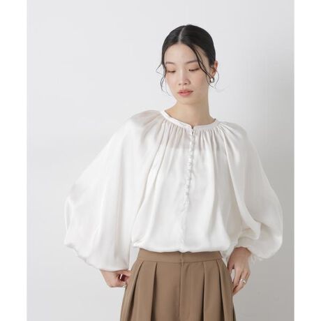 ボリューム感とサテン素材がエレガントな印象のデザインブラウス。クルミボタンがついたデザインとギャザーが寄ったシンプルなデザインの前後2wayで着用可能なアイテムです。