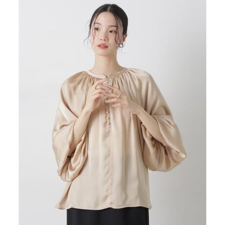 ボリューム感とサテン素材がエレガントな印象のデザインブラウス。クルミボタンがついたデザインとギャザーが寄ったシンプルなデザインの前後2wayで着用可能なアイテムです。
