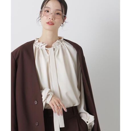 フリルカラーが華やかな印象のボータイブラウス。衿元のリボンを結んだり、衿元を開けて異なる印象で着こなしのアレンジを楽しめるデザイン。上からベストやジャケットなどを重ねてレイヤードコーデや、デニムなどのカジュアルボトムとのスタイリングもおすすめです。