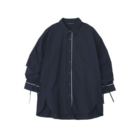 袖のドロストとパイピングがアクセントになったシャツ。