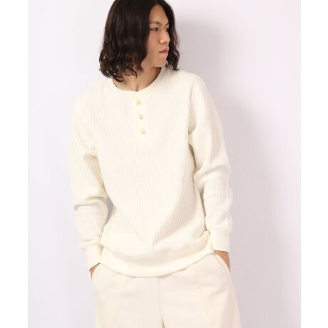 秋、冬、春とロングシーズで人気のある定番アイテムのヘンリーネックタイプです。ワッフル素材特有の型崩れを抑えるため、綿80%/ポリエステル20%の混紡糸を使用しています。スウェットのようにラフに着たり、綿ニットのようにシャツとのレイヤードなど、カジュアルからきれいめまで着こなしの幅が広がります。