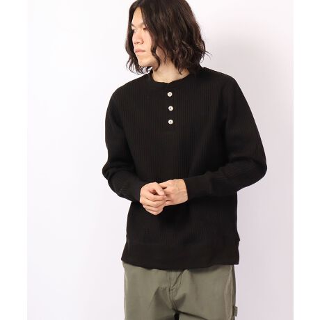 秋、冬、春とロングシーズで人気のある定番アイテムのヘンリーネックタイプです。ワッフル素材特有の型崩れを抑えるため、綿80%/ポリエステル20%の混紡糸を使用しています。スウェットのようにラフに着たり、綿ニットのようにシャツとのレイヤードなど、カジュアルからきれいめまで着こなしの幅が広がります。