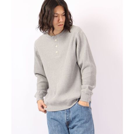 秋、冬、春とロングシーズで人気のある定番アイテムのヘンリーネックタイプです。ワッフル素材特有の型崩れを抑えるため、綿80%/ポリエステル20%の混紡糸を使用しています。スウェットのようにラフに着たり、綿ニットのようにシャツとのレイヤードなど、カジュアルからきれいめまで着こなしの幅が広がります。