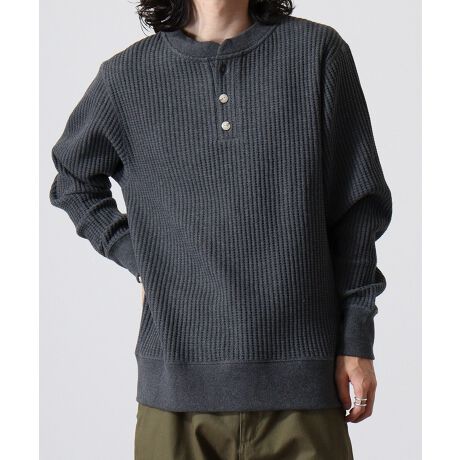 秋、冬、春とロングシーズで人気のある定番アイテムのヘンリーネックタイプです。ワッフル素材特有の型崩れを抑えるため、綿80%/ポリエステル20%の混紡糸を使用しています。スウェットのようにラフに着たり、綿ニットのようにシャツとのレイヤードなど、カジュアルからきれいめまで着こなしの幅が広がります。