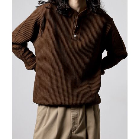 秋、冬、春とロングシーズで人気のある定番アイテムのヘンリーネックタイプです。ワッフル素材特有の型崩れを抑えるため、綿80%/ポリエステル20%の混紡糸を使用しています。スウェットのようにラフに着たり、綿ニットのようにシャツとのレイヤードなど、カジュアルからきれいめまで着こなしの幅が広がります。