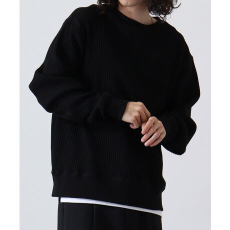 秋、冬、春とロングシーズで人気のあるビッグワッフル素材を使用したビッグサイズのクルーネックです。身幅に余裕のあるルーズシルエットスタイルです。ワッフル素材特有の型崩れを抑えるため、綿80%/ポリエステル20%の混紡糸を使用しています。スウェットのようにラフに着たり、綿ニットのようにシャツとのレイヤードなど、カジュアルからきれいめまで着こなしの幅が広がります。