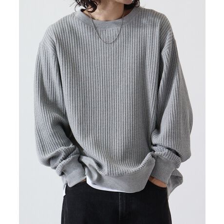 秋、冬、春とロングシーズで人気のあるビッグワッフル素材を使用したビッグサイズのクルーネックです。身幅に余裕のあるルーズシルエットスタイルです。ワッフル素材特有の型崩れを抑えるため、綿80%/ポリエステル20%の混紡糸を使用しています。スウェットのようにラフに着たり、綿ニットのようにシャツとのレイヤードなど、カジュアルからきれいめまで着こなしの幅が広がります。