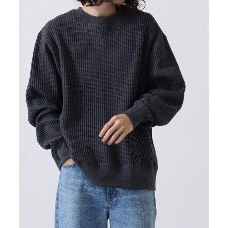 秋、冬、春とロングシーズで人気のあるビッグワッフル素材を使用したビッグサイズのクルーネックです。身幅に余裕のあるルーズシルエットスタイルです。ワッフル素材特有の型崩れを抑えるため、綿80%/ポリエステル20%の混紡糸を使用しています。スウェットのようにラフに着たり、綿ニットのようにシャツとのレイヤードなど、カジュアルからきれいめまで着こなしの幅が広がります。