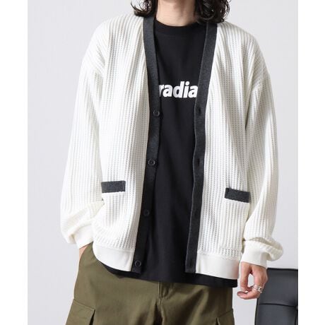 秋、冬、春とロングシーズで人気のあるビッグワッフル素材を使用したVネックカーディガンです。ヘビーウェイトなワッフルでアウターとしても使えるアイテムです。ワッフル素材特有の型崩れを抑えるため、綿80%/ポリエステル20%の混紡糸を使用しています。スウェットのようにラフに着たり、綿ニットのようにシャツとのレイヤードなど、カジュアルからきれいめまで着こなしの幅が広がります。