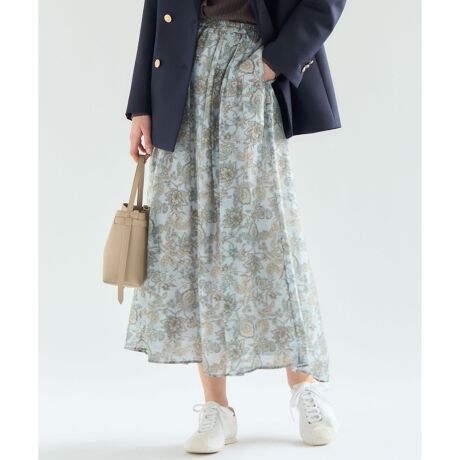 存在感のあるペイズリープリントを主役にした、シンプルなフレアスカートです。程よい分量感がありながらも、透け感のある軽やかな素材を使用しているため、重たくなりすぎず、軽やかな雰囲気でご着用いただけます。歩くたびにしなやかに揺れるシルエットが、コーディネートに上品な華やかさをプラスします。シンプルなトップスと合わせるだけで、洗練された大人のスタイリングが完成する一枚です。 ブラウスやニットと合わせてオフィススタイルに、Tシャツやスウェットと合わせてカジュアルダウンにと、幅広いシーンで活躍します。お食事会や旅行など、少し特別な日のお出かけにもおすすめです。カラーは、柔らかな印象で上品さを引き立てるアイボリー系(502)と、爽やかで洗練された雰囲気を醸し出すサックス系(572)の2色展開です。