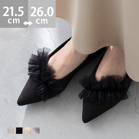トレンド継続中のシアーチュールのフリルとシャープなラインのポインテッドトゥで、甘さと大人っぽさが詰まった贅沢な1足。