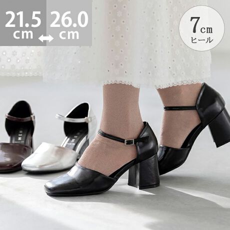スクエアトゥと台形ヒールが存在感を放ち、ストラップ付だから脱げる心配も無く安心の一足です。