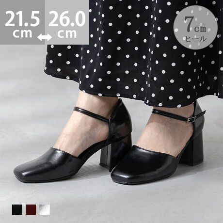 スクエアトゥと台形ヒールが存在感を放ち、ストラップ付だから脱げる心配も無く安心の一足です。