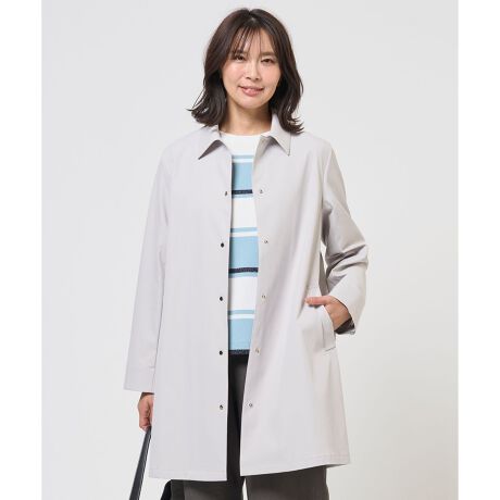 ゆとりのあるAラインシルエットの、さらっと羽織りやすいステンカラーコート。上襟に素材感の違う別布を使用し、さり気ないデザインポイントにしています。フロントには小さめで上品なドット釦を使用しており、控えめながらも洗練された印象を演出します。袖口の内側にテープをあしらい、折り返すとさりげなく覗く配色ディテールが装いに華やかさをプラス。肩幅と身幅をややゆったりとしたサイズ感にしており、インナーのボリューム感をあまり気にする事なく着用できます。釦の開閉も楽にできて気軽に羽織れる、裏地のない仕立ての軽いコートです。