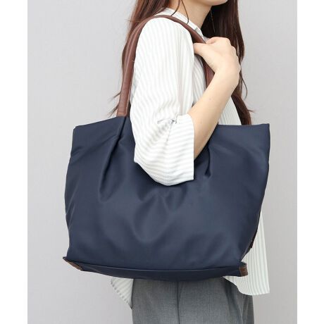 Legato Largo(レラートラルゴ)“肩楽シリーズ”の、大人可愛いトートバッグ。上品な光沢の生地感に、随所に施されたゴールドのパーツや手触りの良いレザー調パーツで、控えめながら華やかさのある大人な雰囲気が魅力。