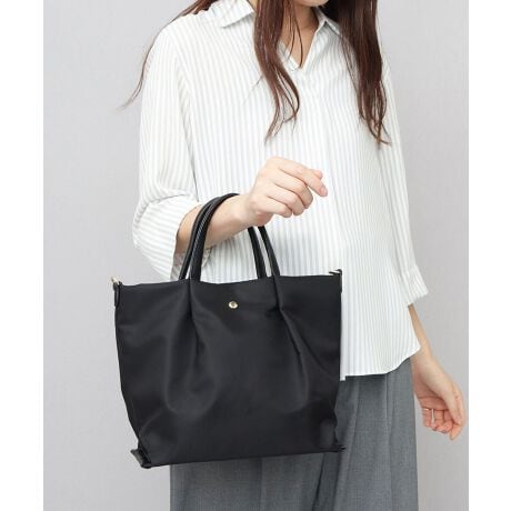 Legato Largo(レラートラルゴ)“肩楽シリーズ”の、大人可愛いショルダートート。上品な光沢の生地感に、随所に施されたゴールドのパーツや手触りの良いレザー調パーツで、控えめながら華やかさのある大人な雰囲気が魅力。