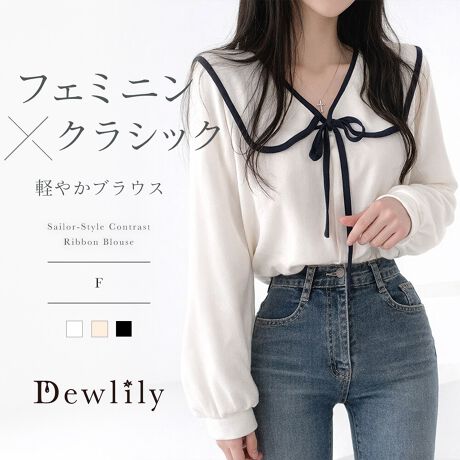 セーラー風の配色ラインとフロントリボンが、可憐で上品な印象のブラウスです。