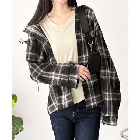 チェックシャツにフードを重ねたようなデザインが、カジュアルな抜け感を演出します。
