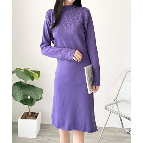繊細なスカラ編み風の表情が、全体に上品な雰囲気を添えるニットワンピースです。