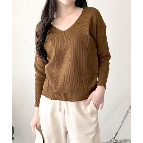 袖口のさりげないボタンデザインが、シンプルな中に女性らしさをプラス。