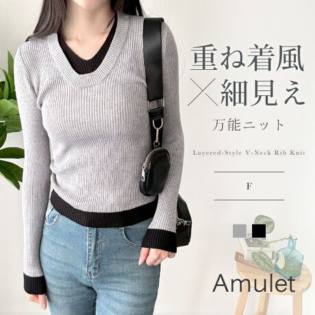重ね着しているように見える、レイヤード風デザインのVネックリブニットです。