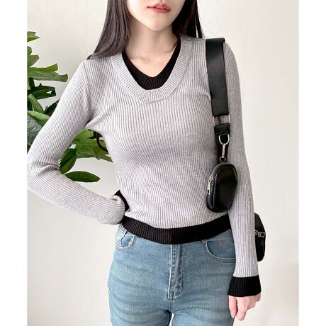 重ね着しているように見える、レイヤード風デザインのVネックリブニットです。