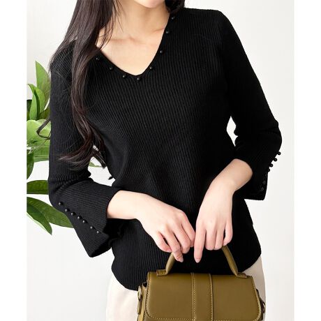 袖口にあしらわれたフェイクパールが、上品な華やかさを演出するリブニットです。