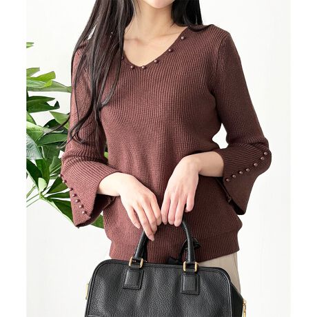 袖口にあしらわれたフェイクパールが、上品な華やかさを演出するリブニットです。