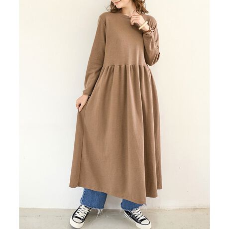 シンプルなクルーネックに、ウエスト切替が映えるロングワンピースです。